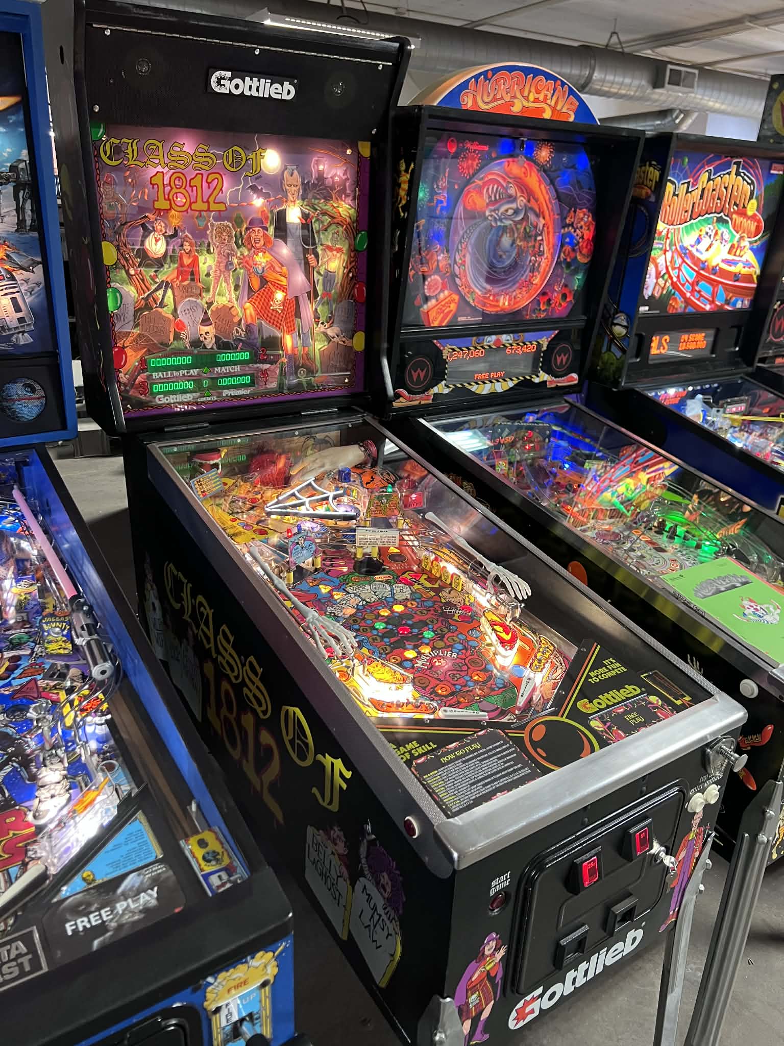 Class of 1812 has a dark theme featuring the reunion of a long dead class. The back glass is a vacuum formed 3D image. During Multiball Madness, a large mechanical beating heart and chattering teeth are synchronized along to chickens clucking the 1812 Overture by Pyotr Tchaikovsky.